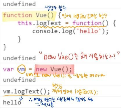 이후 변수 vm으로 new Vue()를 생성할 때마다 // 즉, 생성자 함수로 어떤 객체를 찍을 때마다 객체 안에는 미리 정의한 logText()가 들어가져있기 때문에 매번 함수를 생성하지않고 재사용이 가능.