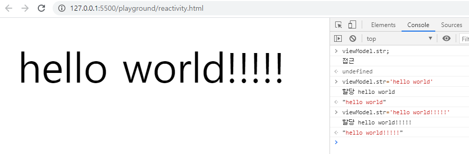 이렇게 get과 set에 동작을 정의하여 매번 함수를 재정의 하지않고 변화하는 문자열을 화면에 바로 보여지게 됩니다.