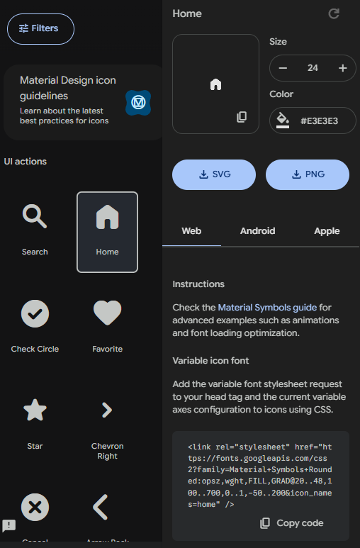 원하는 아이콘을 선택하면 이미지 크기와 색상을 지정하여 SVG / PNG로 이미지를 다운받을 수 있고, 기종(웹 / 안드로이드 / 애플)에 해당하는 코드를 뽑을 수 있다.