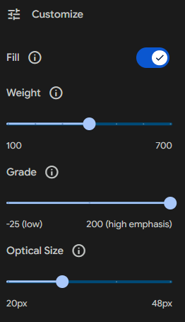 아이콘을 원하는대로 커스텀할 수 있는 옵션(Fill / Weight / Grade / Optical Size)을 조절하여 원하는 아이콘으로 만든다.