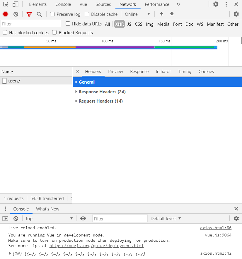 - General : Request URL, method, status code (status code:200은 성공을 의미 : 정상적으로 데이터를 받음)