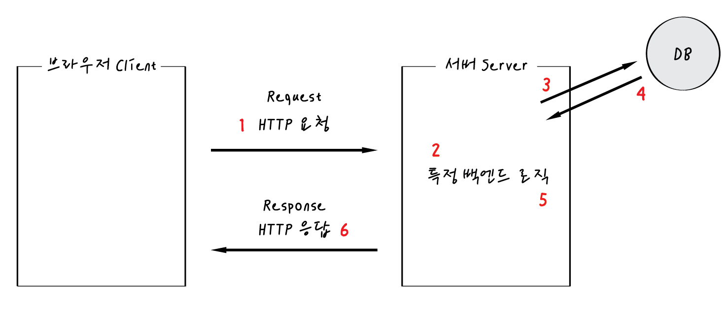 <브라우저 → 서버>로 어떠한 데이터를 요청했을 때, 서버에서 특정 백엔드 로직을 통해 DB로 들어가 해당 데이터를 가지고 나오면서 한번 더 특정 백엔드 로직을 거쳐 <서버 → 브라우저>로 응답하게 됩니다.